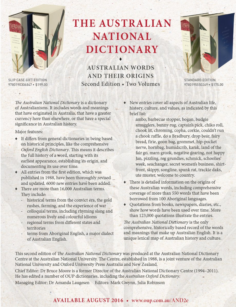 The second edition of the Australian National Dictionary: Australian Words and their Origins was published in August. For detailed information you can read the introduction to the dictionary on the Oxford University Press Australia blog.
