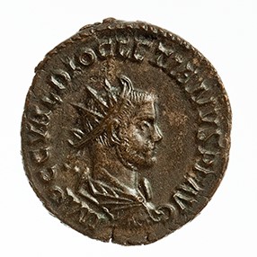 The antoninianus, originally a silver coin, now consists entirely of base metal. The gradual deterioration can be traced through the third century. About AD 294 Diocletian put an end to this state of affairs by completely reforming the coinage and a new small silver coin, the follis, was introduced. As David Sear puts it ‘a radical departure from previous practice was the reintroduction of pure silver in the form of the argenteus’. These smallish silver coins are sometimes called siliquae. (See Sear volume IV p 78, John Melville Jones, A Dictionary of Ancient Roman Coins, Seaby, 1990, pp 24 & 289 for further discussion of silver coin denominations and Diocletian’s currency reforms).