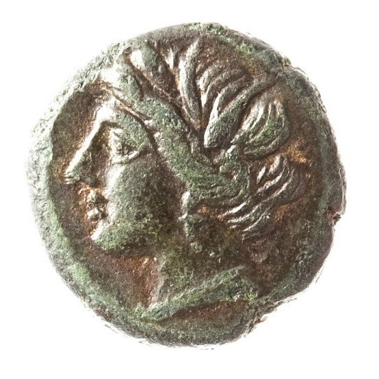 Obv.: Head of Persephone l., wearing ear-ring, hair rolled and held with ears of grain.