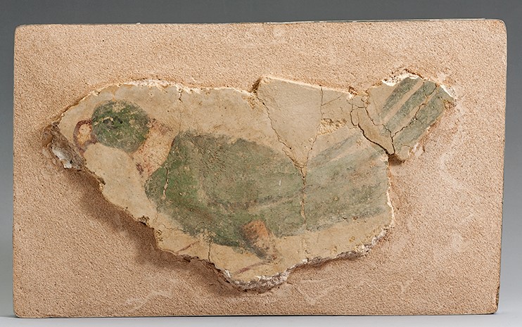 The fragment has a standing bird, left. Much of the paint is faded and the surface somewhat worn. The background is cream. The bird's feathers are mid-green with black for the eye and other details. Its collar is red (mostly worn away); red is used too for the outline of the beak, possibly with yellow. The legs are yellow-brown with red for the lower part.