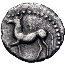 The obverse depicts a horse, a common image on Thessalian coinage. Thessaly was an area of open plains, suited to agriculture and the raising of horses, and as a result was renowned for its cavalry. The Thessalians medized in 480 BC, but around 461 formed an alliance with Athens. In 431, at the start of the Peloponnesian War, six Thessalian cities, including Larissa, sent cavalry contingents to fight for Athens (Thuc. 2.22).
