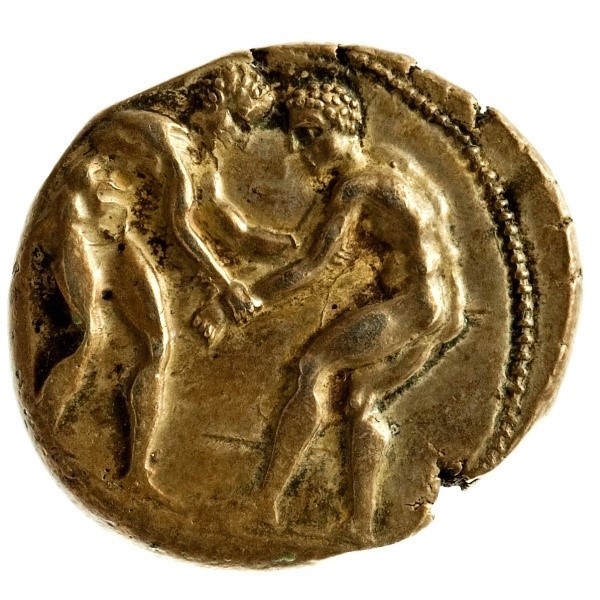 At the beginning of the fourth century BC Aspendos, while retaining the same Persian weight-standard of the stater, made a radical change from the types of the coinage of the previous sixty years, which was something rarely done by a Greek city. The new coinage followed the regional preference for full-length figures rather than portrait-heads. The significance, however, of the motif of the two wrestlers remains elusive. The triskeles on the reverse was the civic badge of Aspendos. This old Indo-European symbol occurs elsewhere on Greek coins.
