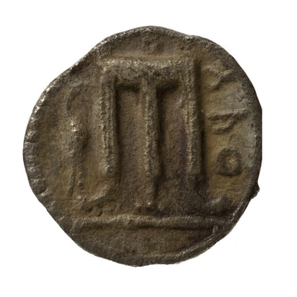 Obv.: Delphic tripod, between stork r. and the Greek letter forms, top to bottom, koppa, mirror rho, omicron.